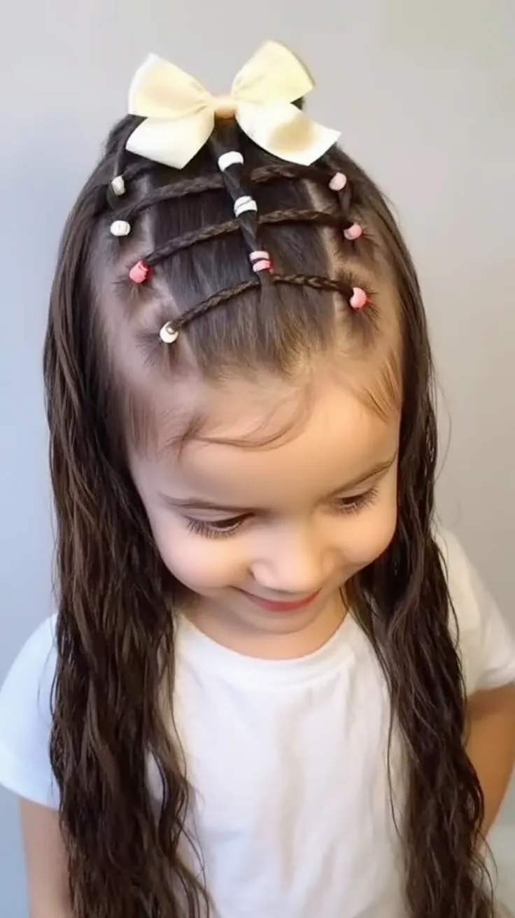 This style feels creative and modern, with multiple small braids coming together in a half-up design. The tiny bows scattered throughout add a charming, handcrafted feel that makes the hairstyle feel extra special.