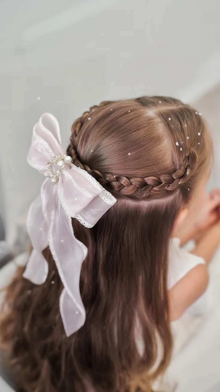 This style works beautifully for thin hair or naturally straight textures that need a bit of visual interest without feeling overdone. It’s an easy option for parents who want something cute but not complicated: braid one side loosely, secure it, and finish with bows that feel festive without stealing the spotlight from her outfit.