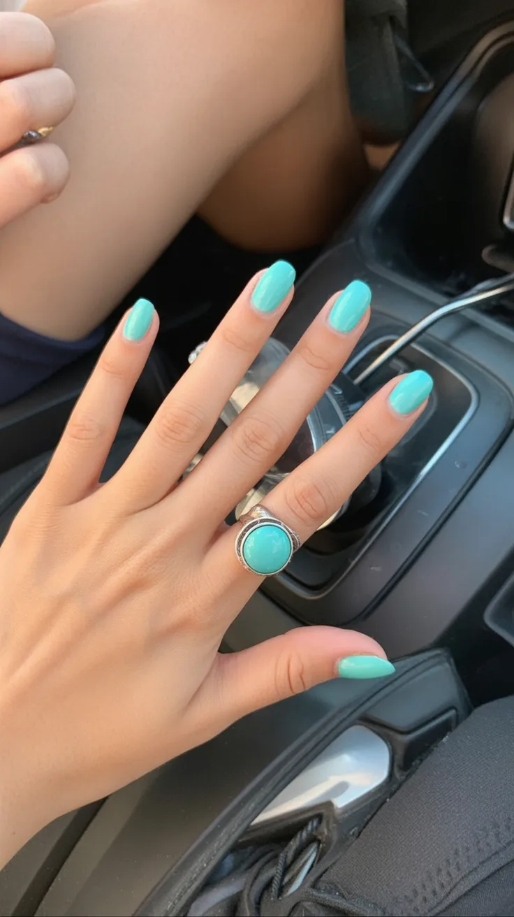 This smooth mint-teal manicure feels calm and quietly elegant, like the first warm morning of the season. The glossy finish gives the color a fresh glow that makes hands look well cared for without needing extra decoration. Sometimes the most striking Designs are the ones that rely on a single beautiful shade. This Simple approach makes teal feel sophisticated rather than loud.
