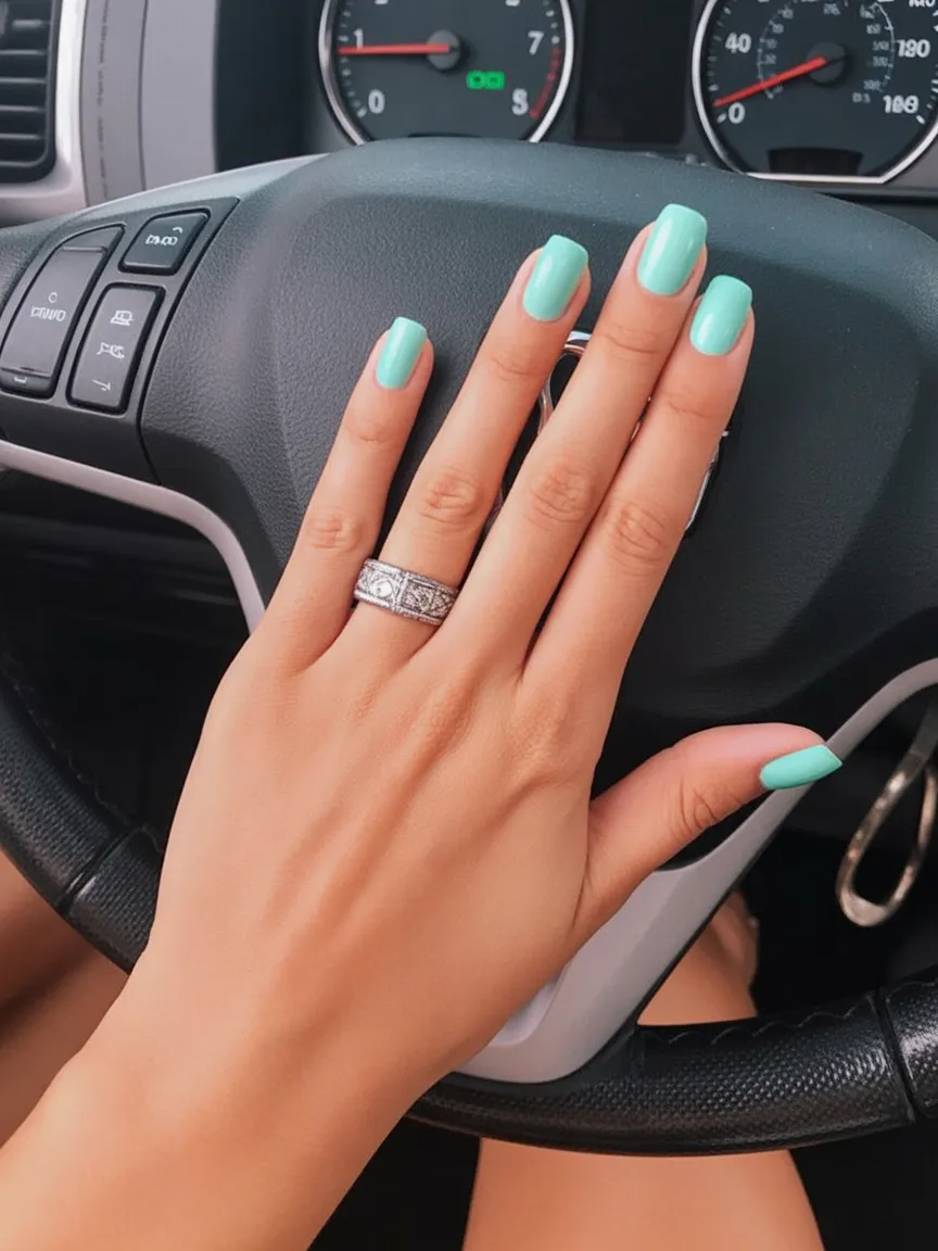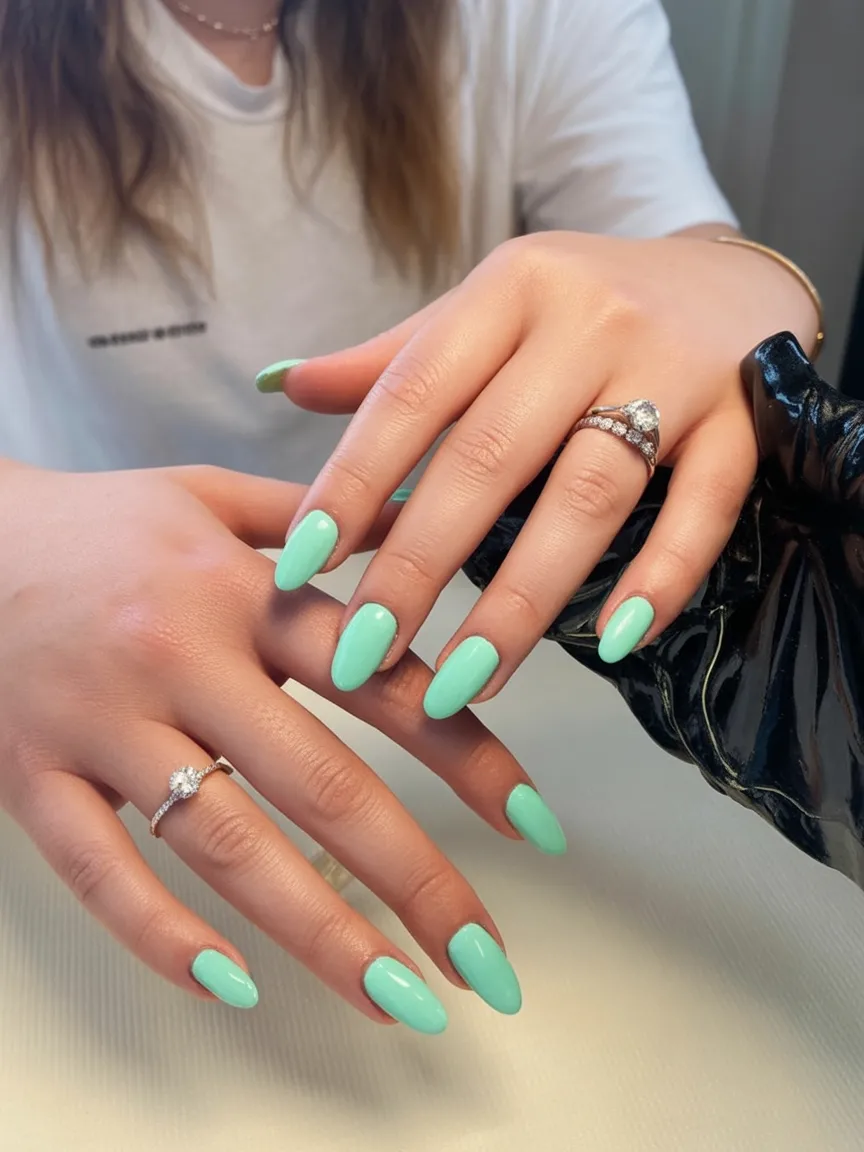 This classic mint-teal manicure feels fresh, clean, and effortlessly stylish. The glossy finish gives the color a bright appearance that makes hands look well cared for without needing extra detail. Sometimes the most appealing Ideas are the ones that rely on a beautiful color alone.