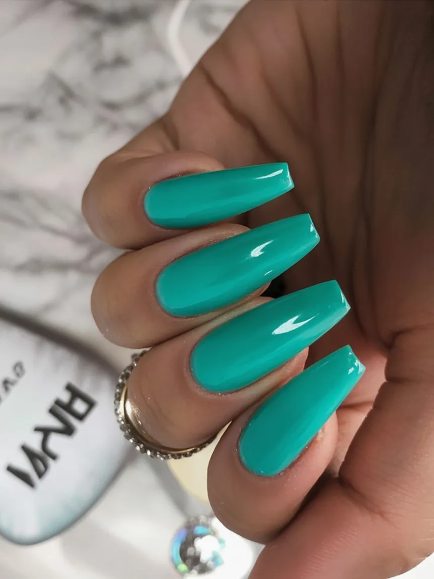 This style works best for women who enjoy dramatic length and strong shapes. Long acrylic nails hold the coffin silhouette beautifully and keep the structure sharp. Compared to lighter teal shades, this deeper tone feels more polished and dressy, making it perfect for evenings out or moments when you want your hands to stand out.