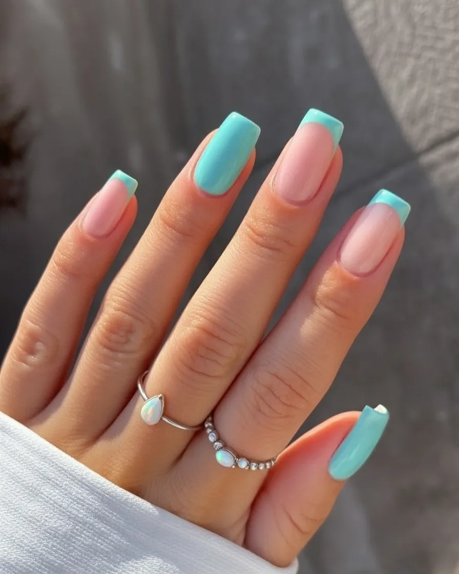 There’s something timeless about a French-style manicure, but this version feels softer and more modern. The delicate pink and sheer base combined with gentle teal tips creates a light and airy effect that feels effortless. It has that quiet elegance that works whether you’re dressed casually or heading somewhere special. This is the kind of nail for spring style that never feels overdone.