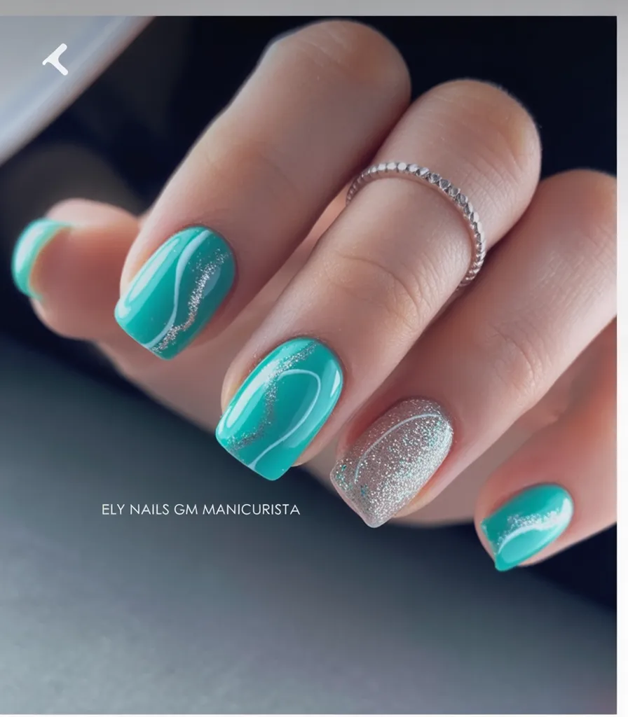 This cheerful manicure proves that shorter nails can still feel special. The soft teal base combined with a sparkling accent nail creates a look that feels both relaxed and festive. Gentle shimmer lines add a hint of movement that keeps the design interesting without overpowering the simplicity. It’s an easygoing style that still feels thoughtfully put together.