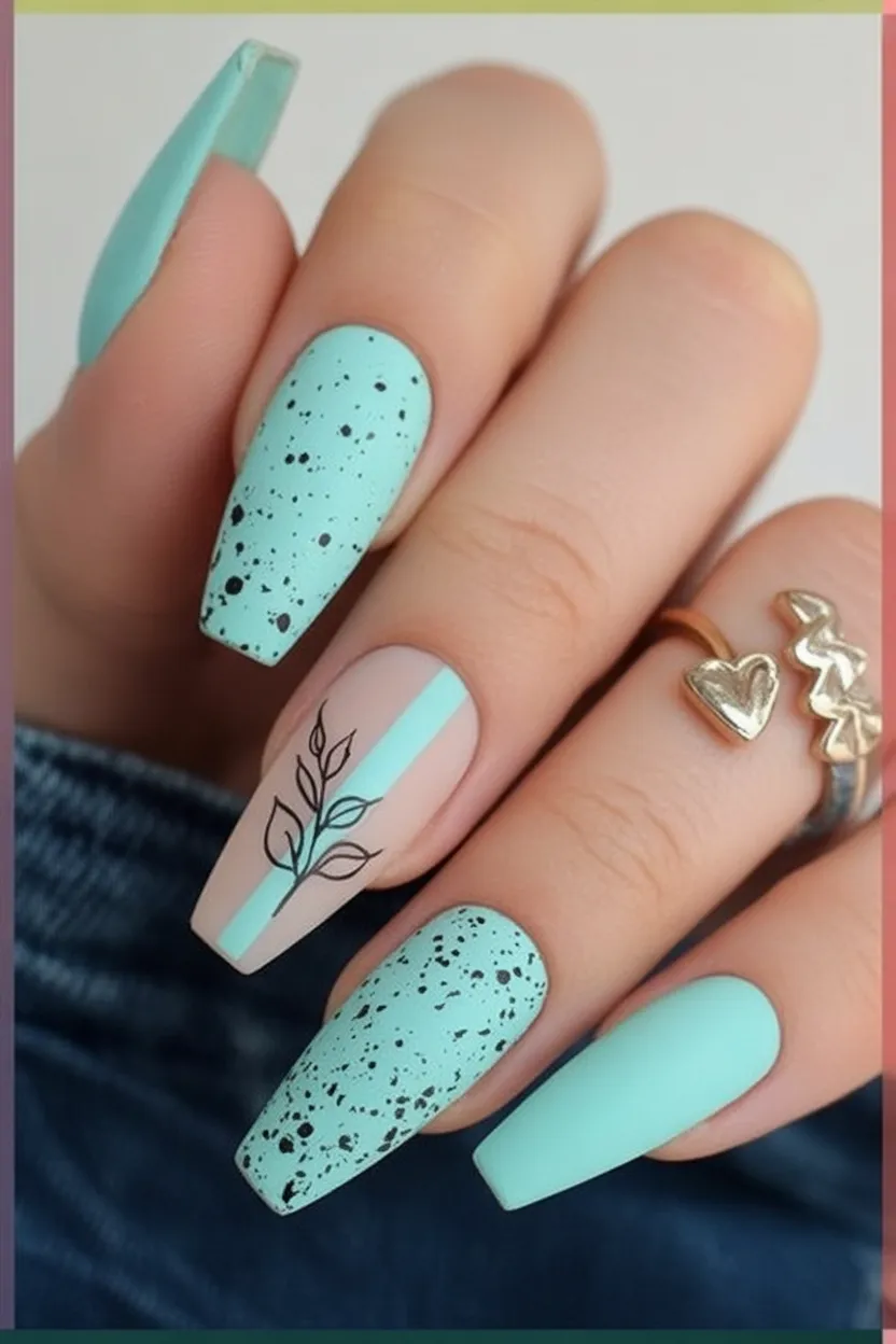 This manicure has a creative, slightly earthy personality that feels incredibly refreshing. The speckled teal surfaces bring subtle texture, while the delicate botanical Art adds a gentle natural touch. It feels modern but organic at the same time, like a little nod to nature carried into everyday style. These Designs feel thoughtful and artistic without looking complicated.
