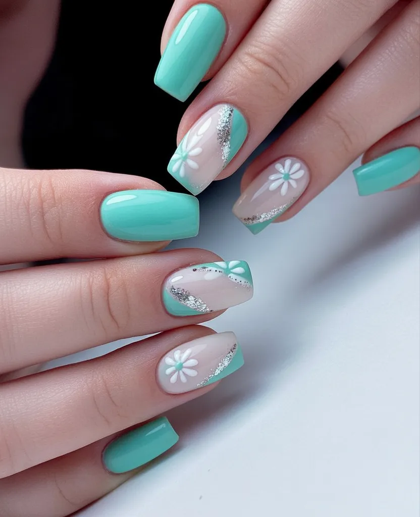 This soft mint-teal manicure feels like a gentle breath of spring air. The delicate balance between sheer bases and glossy color creates a light, feminine look that feels effortlessly polished. Tiny daisies with flowers and subtle glitter waves bring a romantic touch that feels cheerful without being overly sweet. It’s the kind of Inspo that makes nails for spring feel hopeful and fresh in 2026.