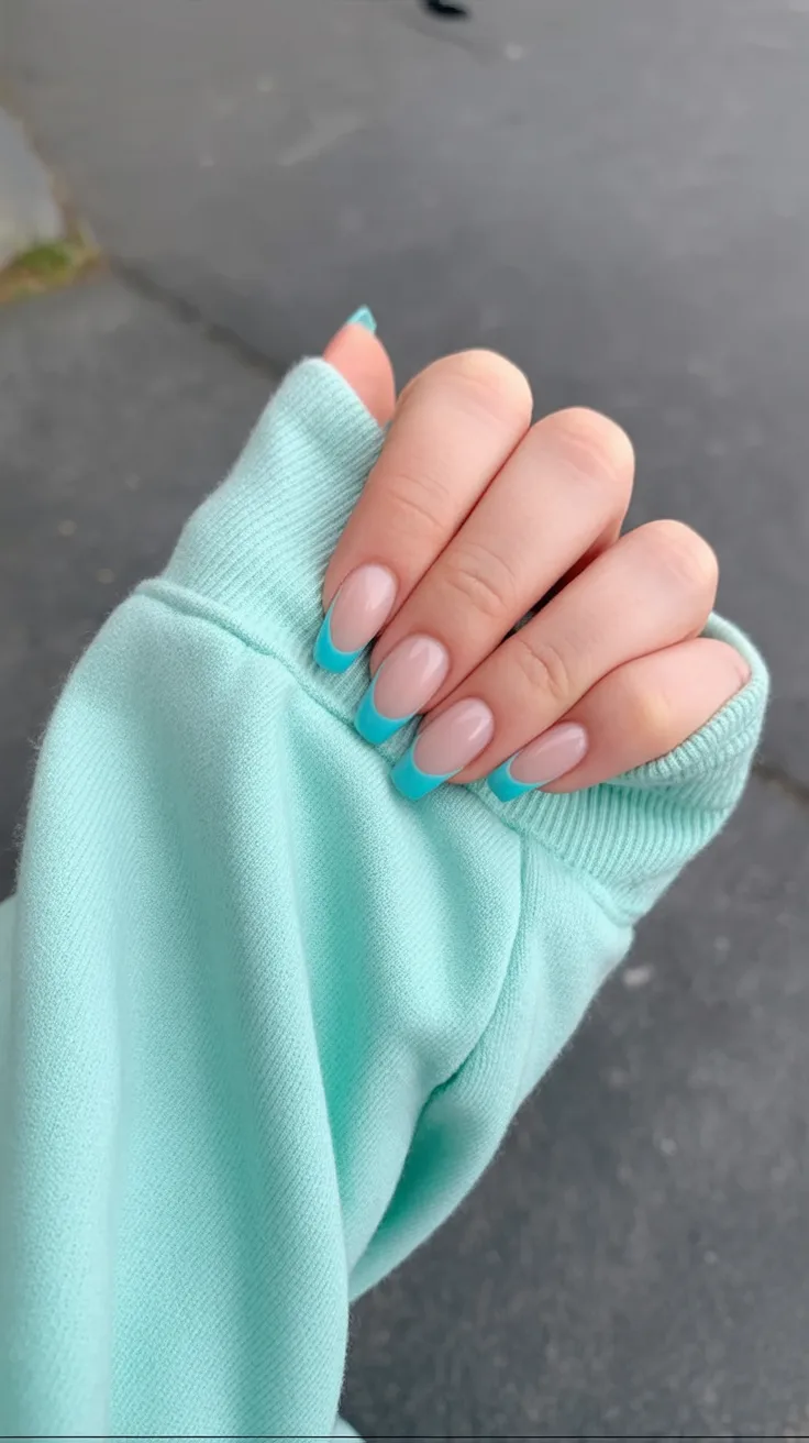 This soft French-style manicure feels clean and refreshing with its gentle teal tips and sheer base. The light tones create an airy effect that feels effortless and polished at the same time. It’s one of those Designs that looks timeless but still perfectly current for 2026.