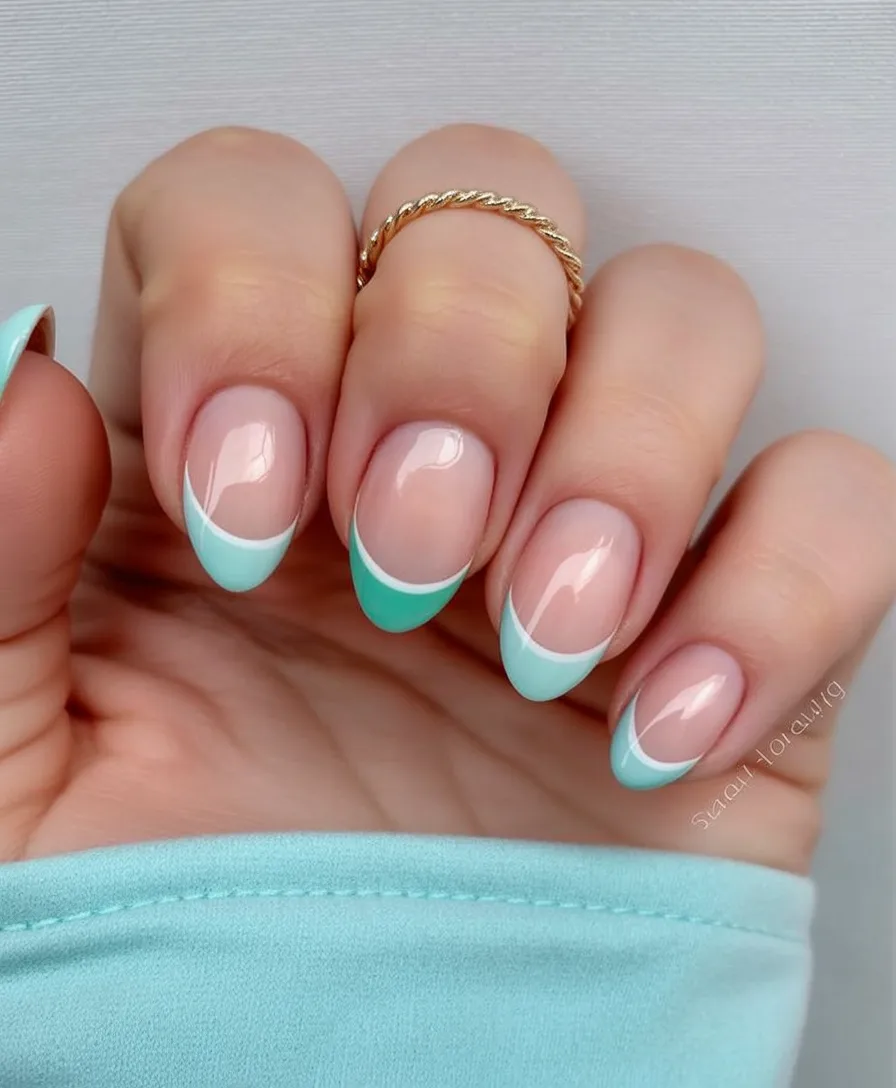 This curved French manicure feels delicate and feminine with its soft teal tips and clean lines. The gentle shape creates an elegant look that feels fresh and refined without being overly decorative. It’s a graceful take on nails for spring that feels timeless and flattering.