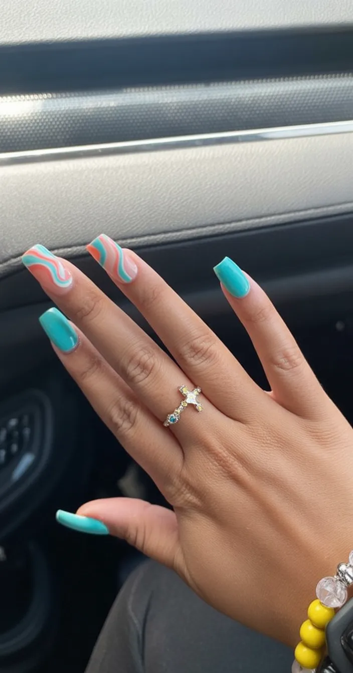 This playful manicure feels like a little burst of sunshine after a long winter. The teal base creates a bright foundation, while flowing lines in pink and Coral and soft white curves bring movement and energy. The mix looks artistic without trying too hard, like a tiny abstract painting on your fingertips. It’s the kind of Inspo that makes you want to refresh your whole wardrobe for spring.