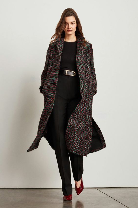 Make a bold statement with a patterned long coat that stands out in a crowd. The intricate design adds a layer of sophistication to a simple black ensemble underneath, perfect for a brisk fall evening. It’s a standout piece for those who value dressy yet practical evening fall outfits.