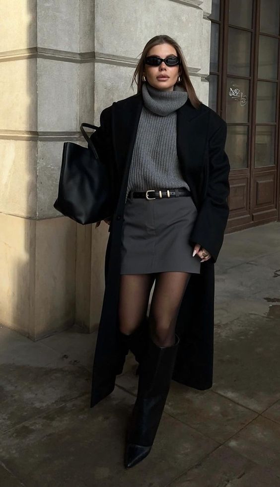 Capture the essence of minimalist chic with a sleek ensemble featuring a high-neck sweater and a short skirt. Paired with a long coat and striking boots, this outfit is ideal for a cold fall evening where style meets simplicity. This look exemplifies fall evening outfits with a dressy yet understated approach.