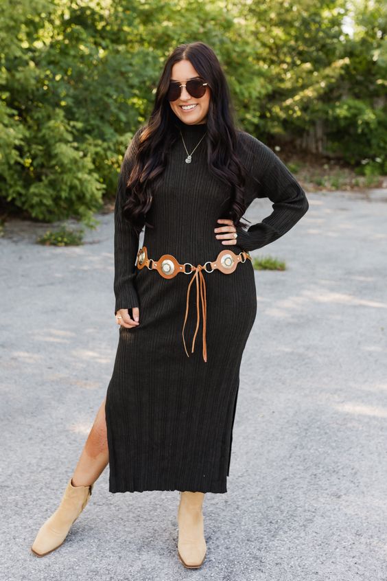 Combine comfort with style in this long ribbed dress complemented by a unique leather belt. The addition of ankle boots enhances its early fall appeal, making it suitable for both day-to-night transitions. This ensemble is not only cozy but also infuses a bit of Western flair into a dressy casual evening.
