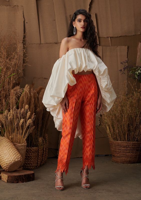 Stand out with this vibrant ensemble featuring an off-shoulder white blouse and bold, zigzag-patterned pants. This outfit blends dressy and casual elements, ideal for a festive fall evening. It’s a testament to how modern trends can echo the dynamic colors of fall.