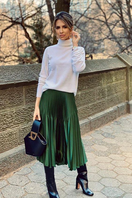 This outfit showcases a blend of soft, neutral tones with a pleated green skirt and a simple white turtleneck, ideal for those who prefer a subtler yet refined look for the evening. It’s an excellent example of evening outfits for women going out fall, combining elegance with seasonal appropriateness.