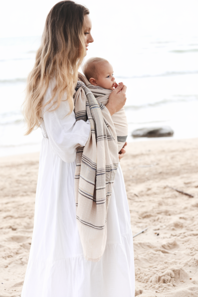 A flowing white maxi dress captures the essence of summer with its airy fabric and timeless design. Paired with a neutral-striped baby sling, this outfit offers comfort and functionality, perfect for a leisurely walk along the beach or a relaxing day outdoors. The loose waves add a touch of boho charm, making it ideal for warm-weather occasions like a kids birthday party or a casual brunch. Add accessories like delicate gold jewelry or a wide-brimmed hat for a more polished look.
