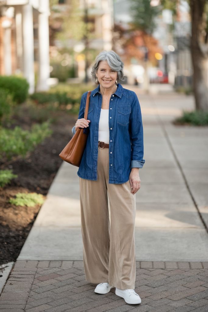A denim button-down shirt styled over a white tank top and beige wide-leg trousers offers an effortlessly chic and cozy look. Paired with white sneakers, this outfit is perfect for everyday errands, a walk in the park, or even a kids birthday party. The brown leather tote adds a warm contrast, keeping the ensemble elegant yet practical.