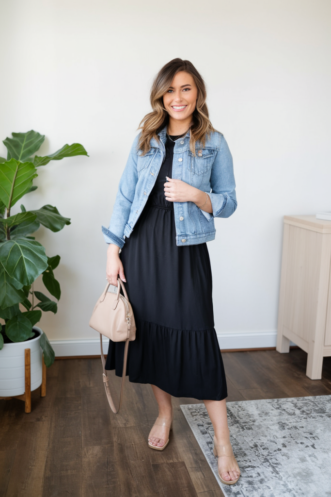 A tiered black maxi dress paired with a light denim jacket offers a classy yet easy look suitable for any occasion, from casual lunches to wedding showers. The nude sandals and structured beige handbag add to the outfit’s elegant appeal, making it ideal for spring and summer.
