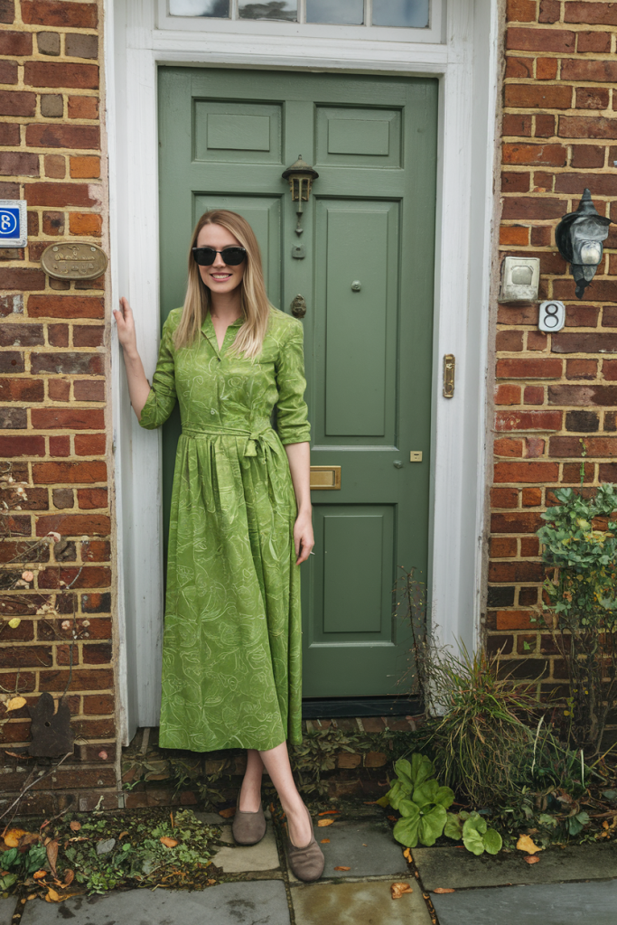 A vibrant green midi dress with puff sleeves and a tie-waist detail offers a stylish and elegant option for summer lunches, weddings, or even a Haldi ceremony. The brown platform sandals add a trendy touch, while the flowy fabric keeps it comfy and breezy.