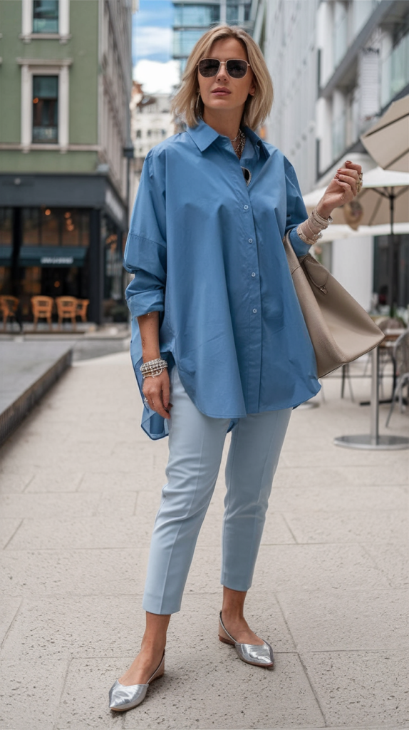 An oversized blue button-down shirt paired with slim-fit trousers offers a relaxed yet stylish look, ideal for a busy day of errands, school drop-offs, or a quick lunch meeting. The rolled sleeves and unbuttoned collar add a touch of modern casualness, while the silver flats and large tote bag enhance the practicality of the ensemble.