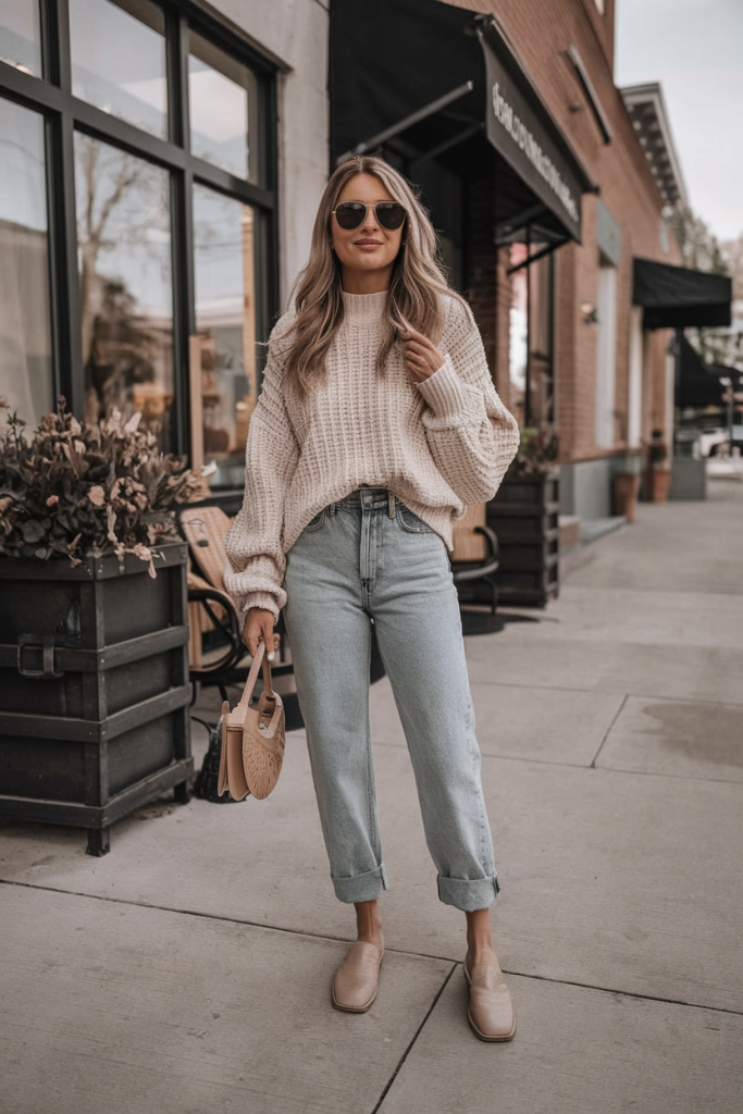 A chunky knit sweater paired with relaxed denim jeans is the epitome of cozy everyday wear. This ensemble is perfect for chilly winter mornings, casual playdates, or weekend errands. The neutral tones keep it versatile, while the cuffed jeans and slip-on loafers add a touch of modern ease.