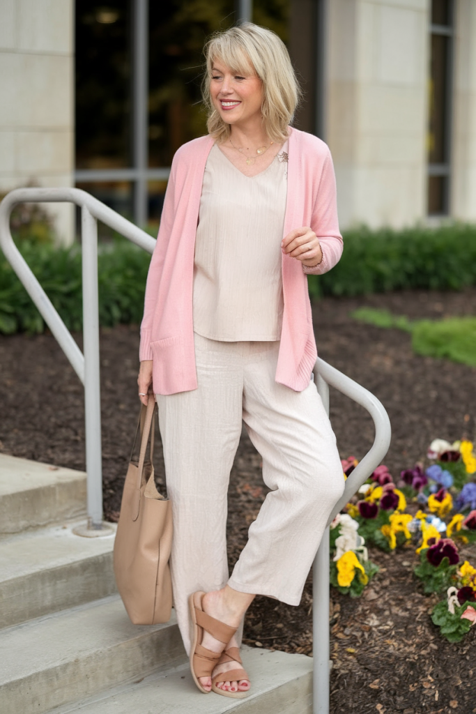 A pastel pink cardigan over a soft cream top and wide-leg trousers creates a delicate and elegant ensemble, ideal for a day at the park, a birthday celebration, or a casual office setting. The open cardigan offers flexibility, while the neutral sandals and tote bag add practicality.
