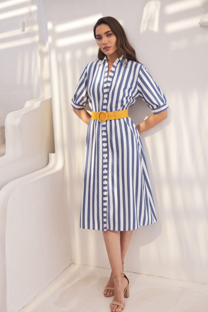 A blue and white striped shirt dress cinched at the waist with a bold yellow belt is a standout choice for moms who love trendy yet classy outfits. This look is perfect for summer gatherings, weddings, or even a Haldi ceremony, offering both comfort and style.