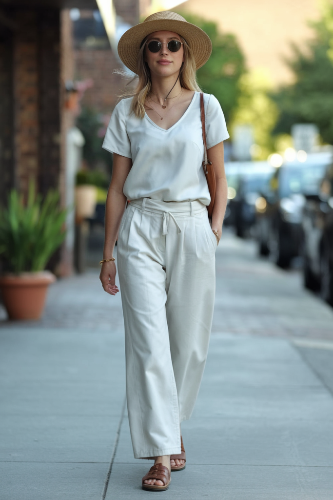 A relaxed white V-neck top paired with high-waisted linen trousers offers a breathable and comfy choice for hot summer days. The straw hat and brown sandals add a boho touch, making it perfect for beach outings, park visits, or a casual party.