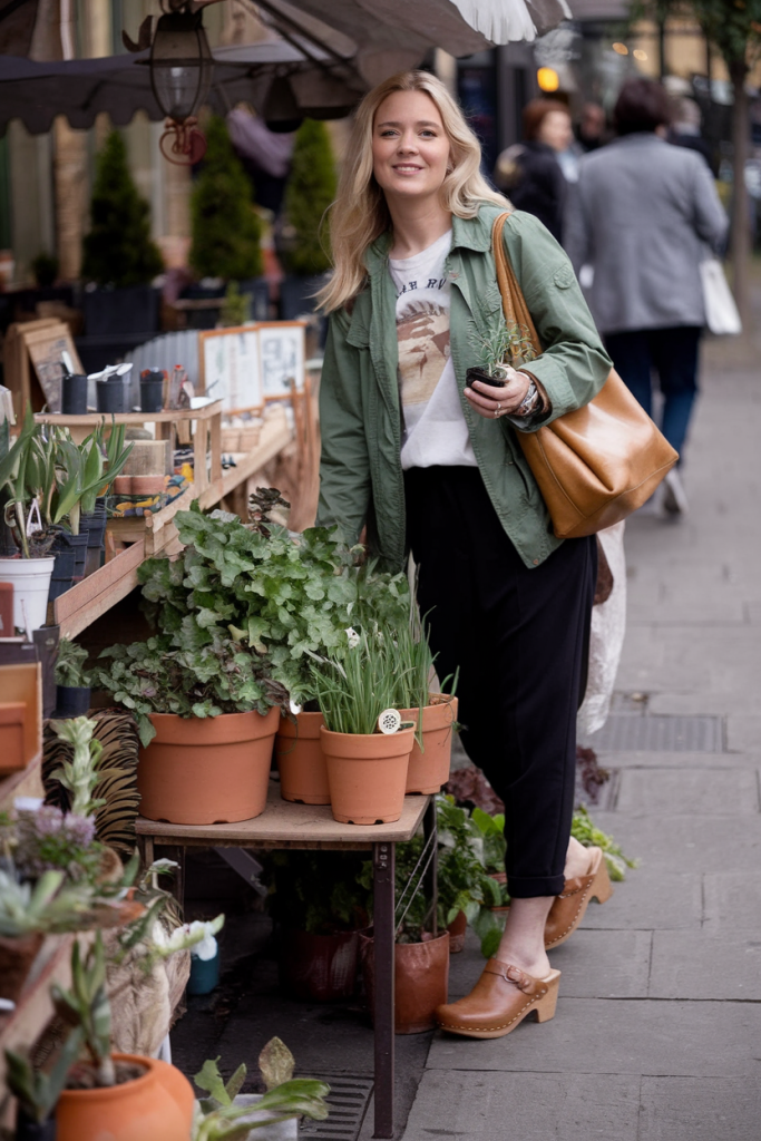 An olive-green utility jacket layered over a graphic tee and black tapered pants creates a casual yet trendy ensemble perfect for a market run or a quick coffee date. The tan leather tote adds a classy and functional touch, while wooden clogs bring in a hint of boho charm. This outfit is ideal for a spring or fall day, offering both comfort and style for busy moms on the go.