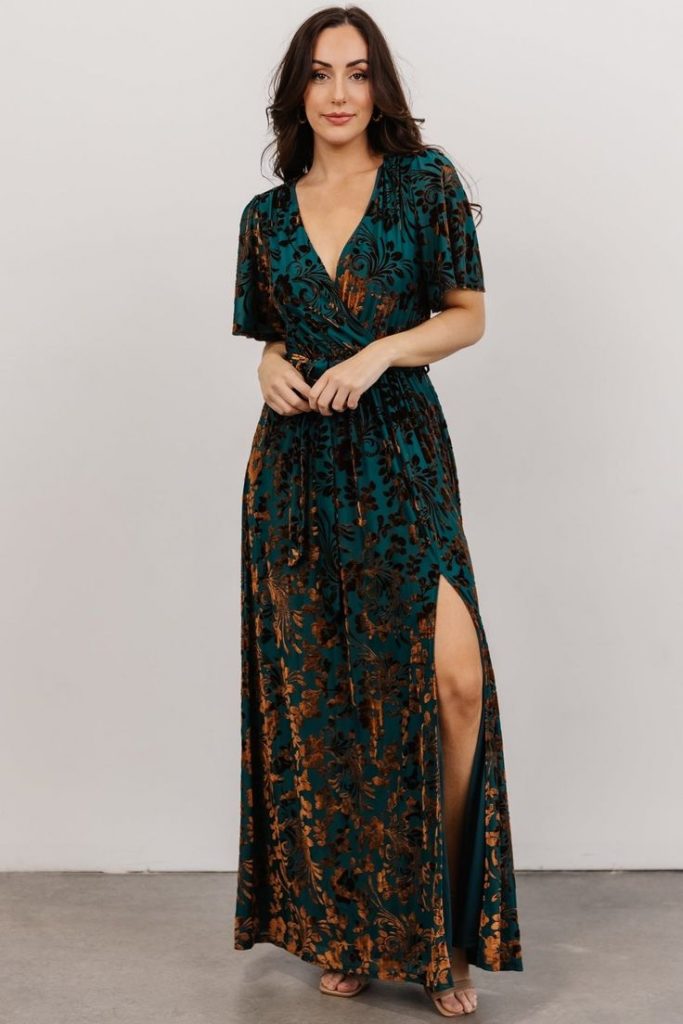 This long velvet dress in emerald green is nothing short of show-stopping. Perfect for an occasion like a gala or a grand birthday celebration, its tasteful knot and V-neck design accentuate the neckline. This is where velvet dresses outfit with boots could make an adventurous pairing, especially if you opt for knee-highs in a complementing shade.