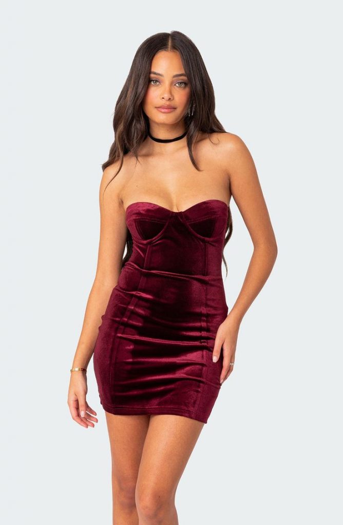 Strapless and stunning, this short blue velvet dress is a statement piece that’s both bold and beautiful. The simplicity of the design makes it versatile, ready for a night out with a velvet dresses outfit winter edge, especially when paired with a faux fur coat.