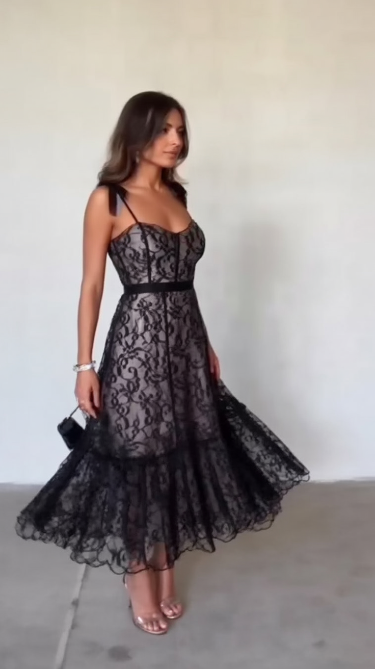 11. Black Lace Tea-Length Dress for Dramatic Evenings