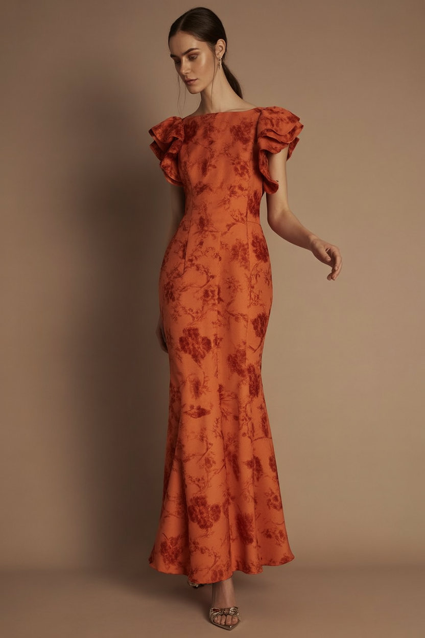 This burnt orange gown is an autumn lover’s dreams come true—a deep, warm, and sultry gown that makes a gorgeous impression. The floral patterned texture of the gown adds an extra layer of beauty that complements the gown’s beauty with the ruffled shoulders that scream haute couture. This wedding guest gown of choice for the year 2026 makes an impression at an autumn and winter wedding that wants a touch of personality with a burst of flavor that isn’t the typical jewel tones of the typical guest gown. The clean silhouette makes anyone near this woman appear statuesque and makes for great photography.
