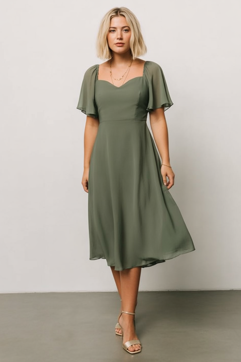 This sage midi dress is all about quiet elegance. The soft flutter sleeves, gentle sweetheart neckline, and fluid skirt make it the perfect choice for daytime ceremonies, especially in spring when everything feels fresh. The muted green shade is flattering on so many skin tones and reads classy without trying too hard. It’s a wedding guest dress for 2026 that you can dress up or down depending on whether the invite leans more toward garden casual or light cocktail.