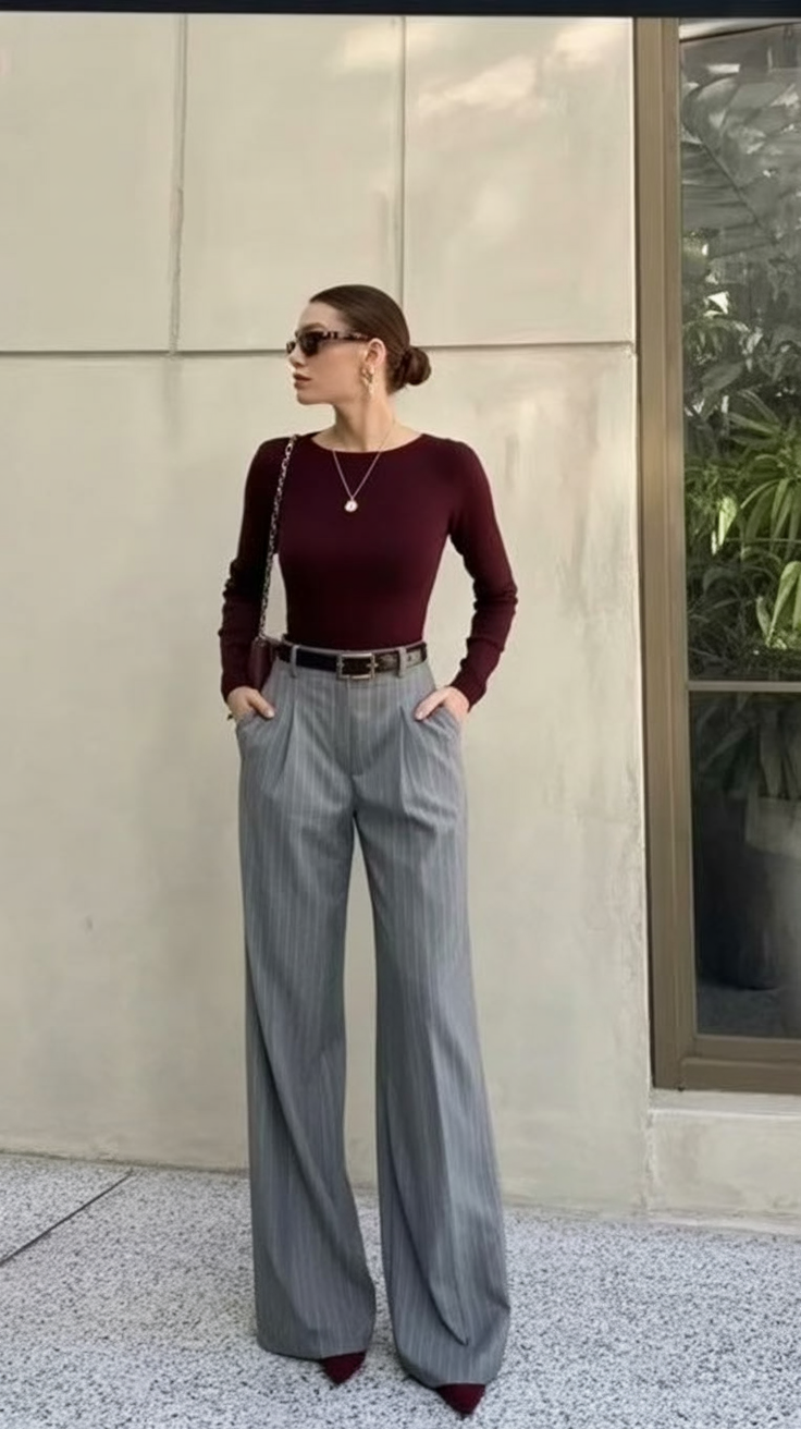 There’s something very refreshing about the combination of the sky blue blouse and the soft gray trousers. Really, the blouse looks like the color of the sky on a clear blue day. This combination looks beautiful if you want your work clothes in 2026 to seem like they are radiating optimism rather than drabness. However, the whole combination looks perfect paired with the high black purse and the nude heels. To accessorize, pull the blouse semi-loosely into the waistband and blouse out for shape without clinging to the stomach. Roll the sleeves once or twice for smart casual styling, or keep them buttoned for business meetings. Adding a slim belt in a neutral color pulls the whole outfit together seamlessly by not breaking the line. It’s easy, but by adding some styling nuance to the outfit altogether, the whole outfit looks extremely polished and on-trend.
