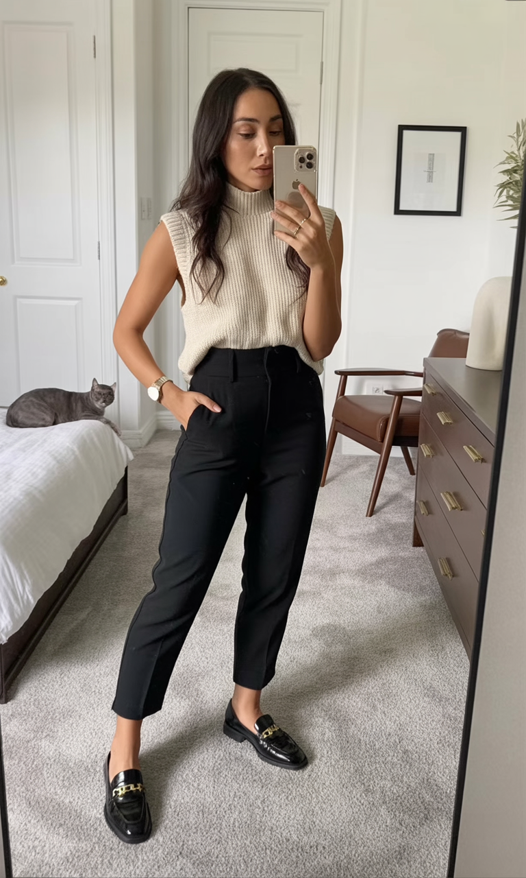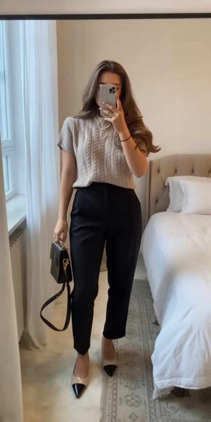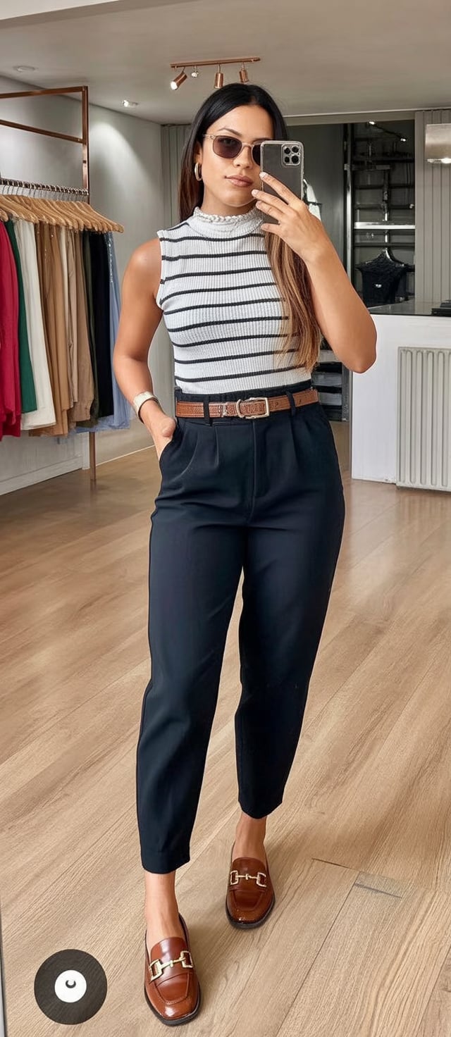 This outfit is the epitome of smart casual. It consists of the striped sleeveless knit, high-waisted black trousers, and the fancy loafers. That means you do not require to change your outfit from work to school. Such is the needed energy for the 2026 woman. But the best part of this combo is how low maintenance it is. There are no intricate layering processes to follow. Simply slide on the combo and pair it with loafers. This combo’s knit fabric is also very comfortable. It’s especially good if your office starts heating up during the latter part of the afternoon. Also, the relaxed fit through the legs means that you can freely move the legs while still maintaining the slim cut. This combo is perfect for busy career women who don’t want to spend too much time deciding on what combination to wear to the office.