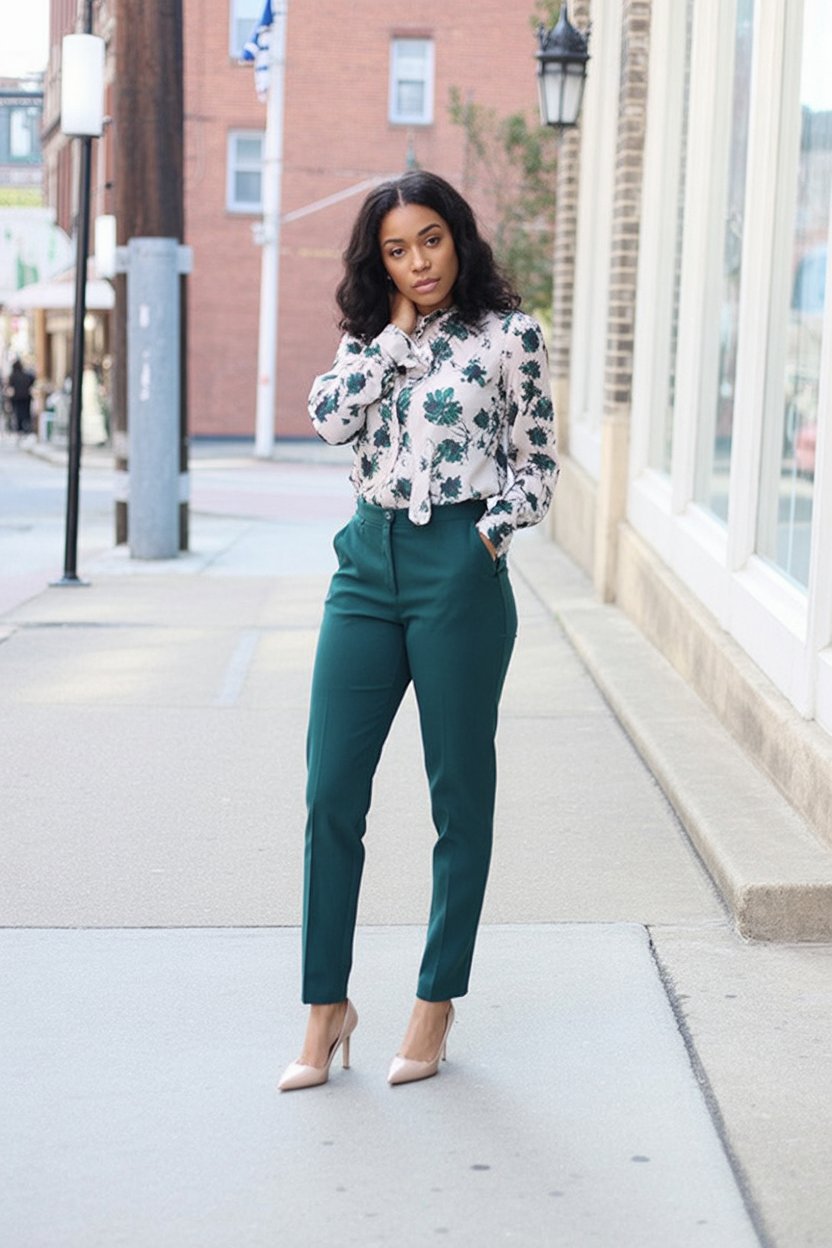 Green is the answer if you’re ready to ditch the same old boring color code in the fashion department but don’t want to hear from the boss’s wife in HR. Rich jewel-colored green trousers paired with an entertaining floral blouse are like hitting the reset button. Such an attractive combination simply screams polished professionalism. That’s one of those fun-and-everybody-looks-like-a-million-bucks-and-still-looks-professional ideas that works in meetings in the middle of February.