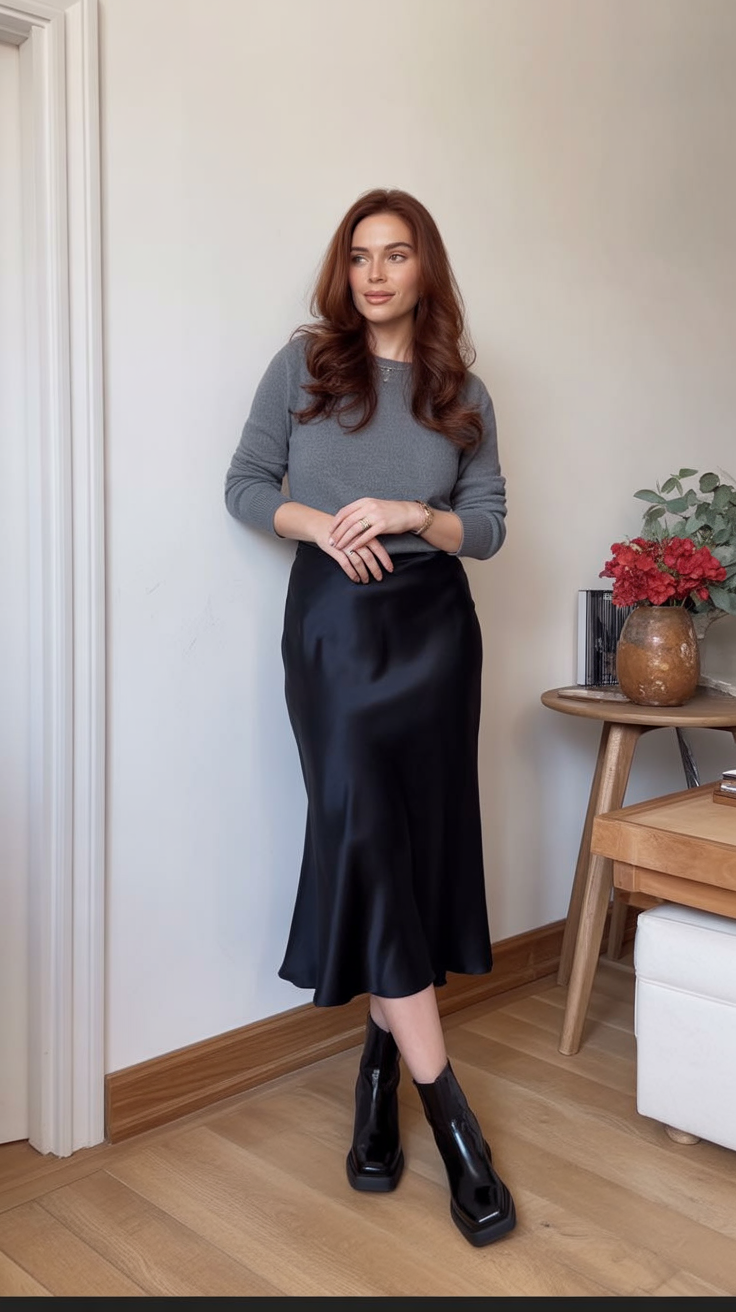 This combo is all about quiet sophistication. A soft grey knit paired with a flowing black satin midi skirt creates a look that’s both elegant and relaxed—perfect for women who want their work outfits to feel grown-up but not too serious. Chunky ankle boots give the outfit a slightly edgy twist and make it office-appropriate for women in winter and autumn alike. The vibe here is “editor on a deadline”: creative, confident, and a little mysterious. The knit keeps things grounded and practical, while the skirt catches the light as you move, adding a subtle sense of drama. It’s ideal for open-plan offices, creative agencies, or any environment where chic personal style is appreciated. Add a red lip or statement earrings when you need to dial up the impact for after-work drinks.