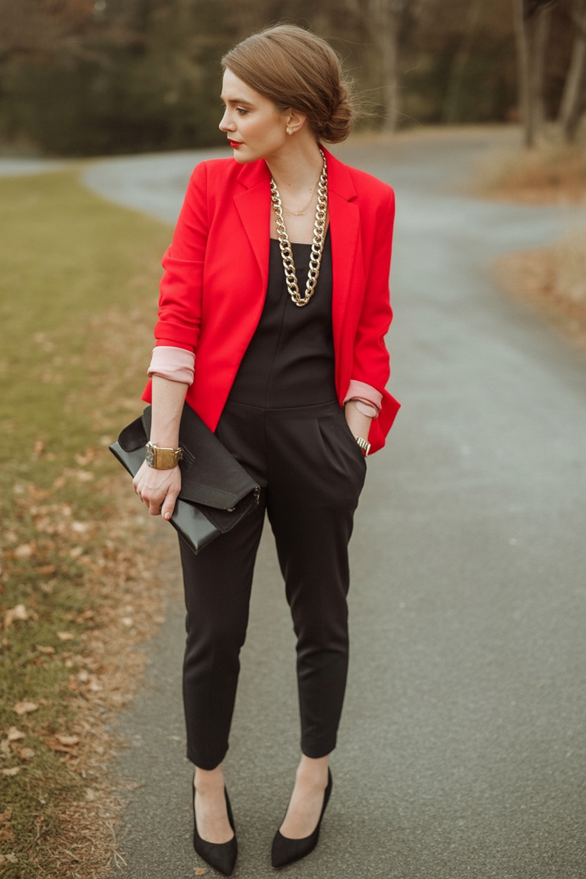This is the going-to-conquer-the-day outfit. And by “conquer the day,” we mean “conquer the world.” Start out with the sharp silhouette of the black jumpsuit. Add the dramatic red blazer. Finish the whole effect off with the thick chain-link necklace. Yes—it’s bold. But remember: if anyone’s going to rock the red blazer in the workplace, it’s going to be you. If you’ve been living in dresses and separates, consider the jumpsuit the wake-up call you’ve needed. This outfit allows you the convenience of wearing one-piece clothing yet packing the punch of a whole suit. The blazer helps to provide much-needed structure for the outfit to make it business-ready. Meanwhile, the black heels ensure the silhouette remains slim and chic. Office-bound females who want something new for 2026 will love the combination of all the aforementioned.