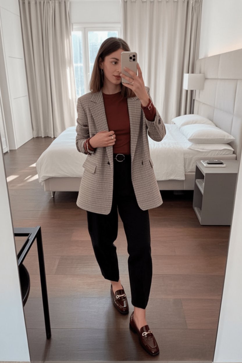 Calling all those days when you want to look polished but don’t want to wear the whole works. This check blazer and rust top combo paired with slim black trousers hits the sweet spot. That’s the perfect fix for the 2026 woman who wants to make it clear that “I tried, but not too much.”