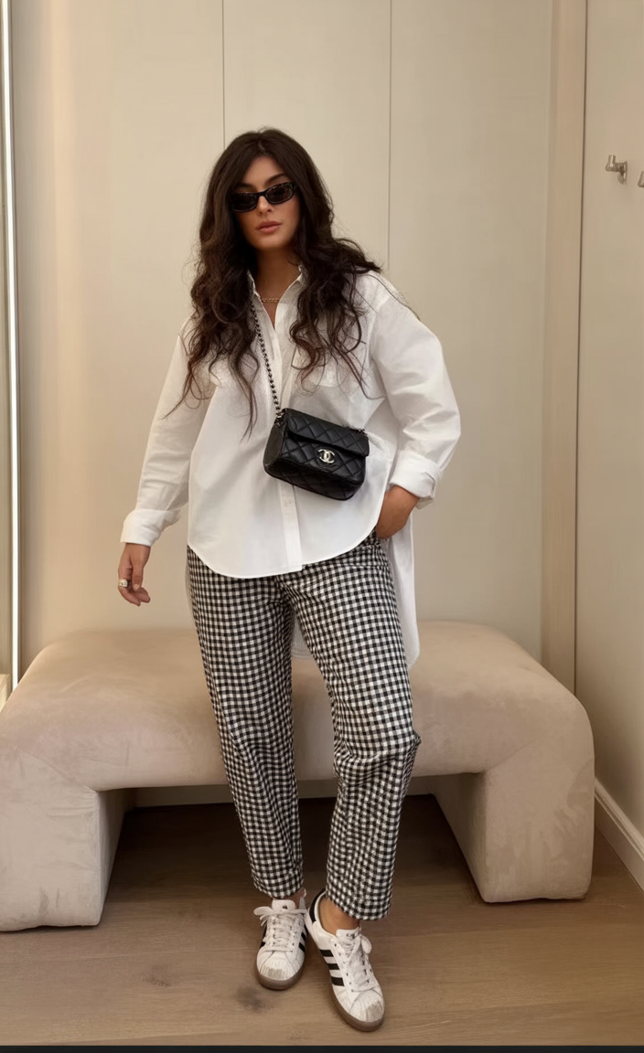 Here’s a look that feels straight off a street-style shot yet works beautifully for relaxed offices. The crisp oversized white shirt paired with checked trousers and comfy sneakers gives Boho-meets-minimal vibes—casual but still thoughtfully styled. A crossbody bag and slim sunglasses bring everything into 2026 territory, making it perfect for women who like their office outfits with a dash of personality.