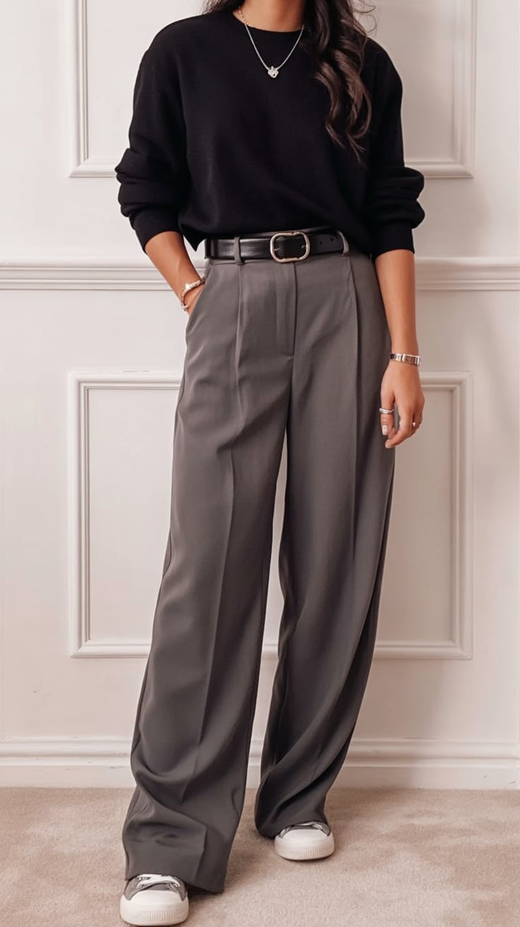 This combination directly relates to the current 2026 trend of having high levels of comfort—true office wear for women who can actually move. Wide legs with some flow are all the rage now, and if you want the ability to comfortably sit without the restriction of tight legs, they’re a godsend. Use a medium-weight knit fabric that drapes rather than clings, then ensure the hem of your legs ends just kissing the top of your sneakers for the boldest line. It’s perfect for Casual Fridays in the office, workdays in the creative industry, or the days you head out on the plane because you want to come off polished and on-trend.