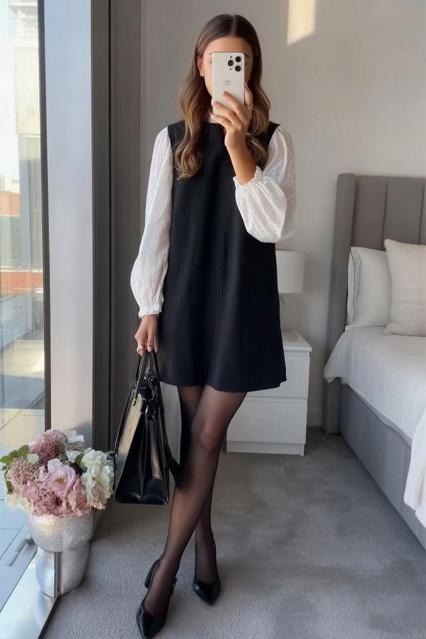 This outfit is such a great tribute to 60’s fashion but perfect for busy career ladies in the office. This simple black shift dress is pretty much the epitome of career chick fashion statements. The white blouse with romantic sleeves peeking through keeps the simple silhouette interesting. Sheer tights paired with pointed heels make you super polished and schoolgirl chic—you know, the good-girl-gone-dirty-girl vibe. This outfit is perfect if you have to make a presentation in the conference room OR if you want to roll out for drinks afterwards.