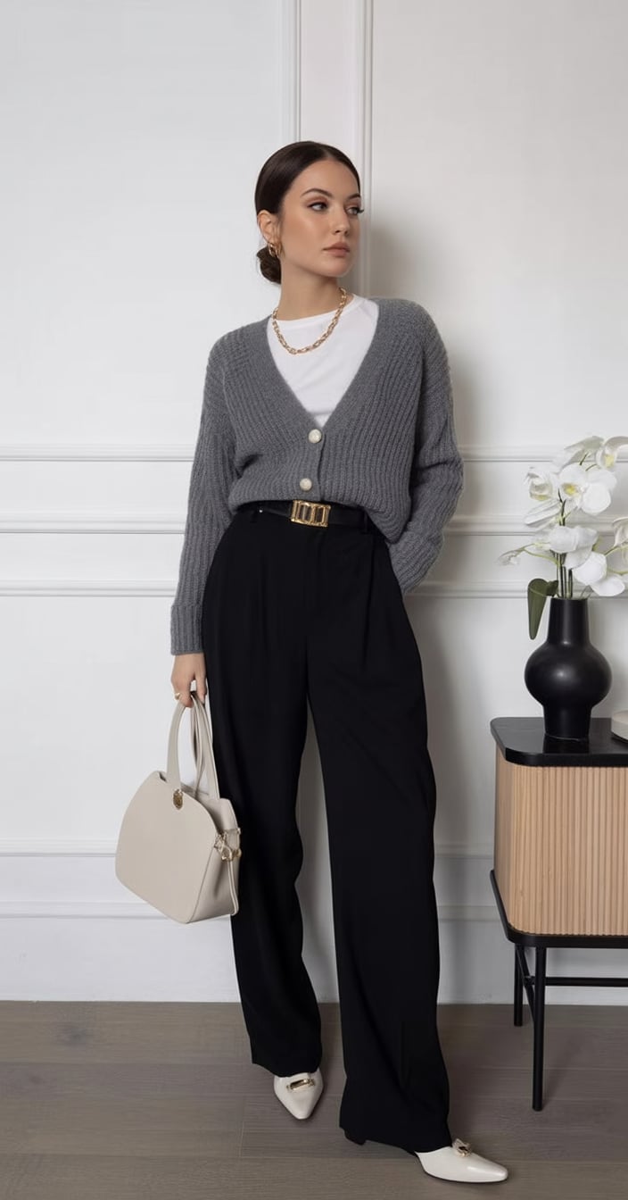 This outfit radiates the quiet luxury—the fashion that doesn’t call attention to itself but mysteriously gets the onlooker’s attention. Gray cardigans on top of the white tee and drapey black trousers create the effect of polished elegance in spite of the ease. Adding the creamy purse and the pointed flats brings the outfit to the smart casual level. It’s perfect for the woman who wants her wardrobe to radiate the feeling of being stress-free despite the busyness in her life.