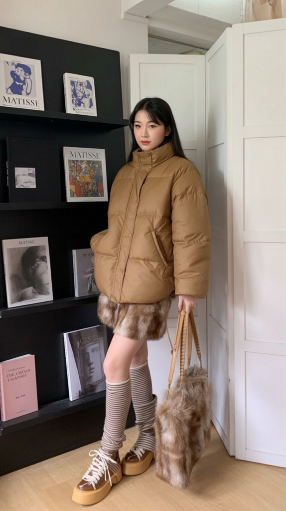 This glance is all Y2K glamour with a little bit of whimsical detail. The luxurious fur coat over denim shorts brings to us that out of the world combination of fancy and casual. Together with large earmuffs and a Hello Kitty bag, it exploits nostalgic Cute feelings and still feels new and stylish. The high boots are a height and theatric and this makes this an outstanding look of the season.