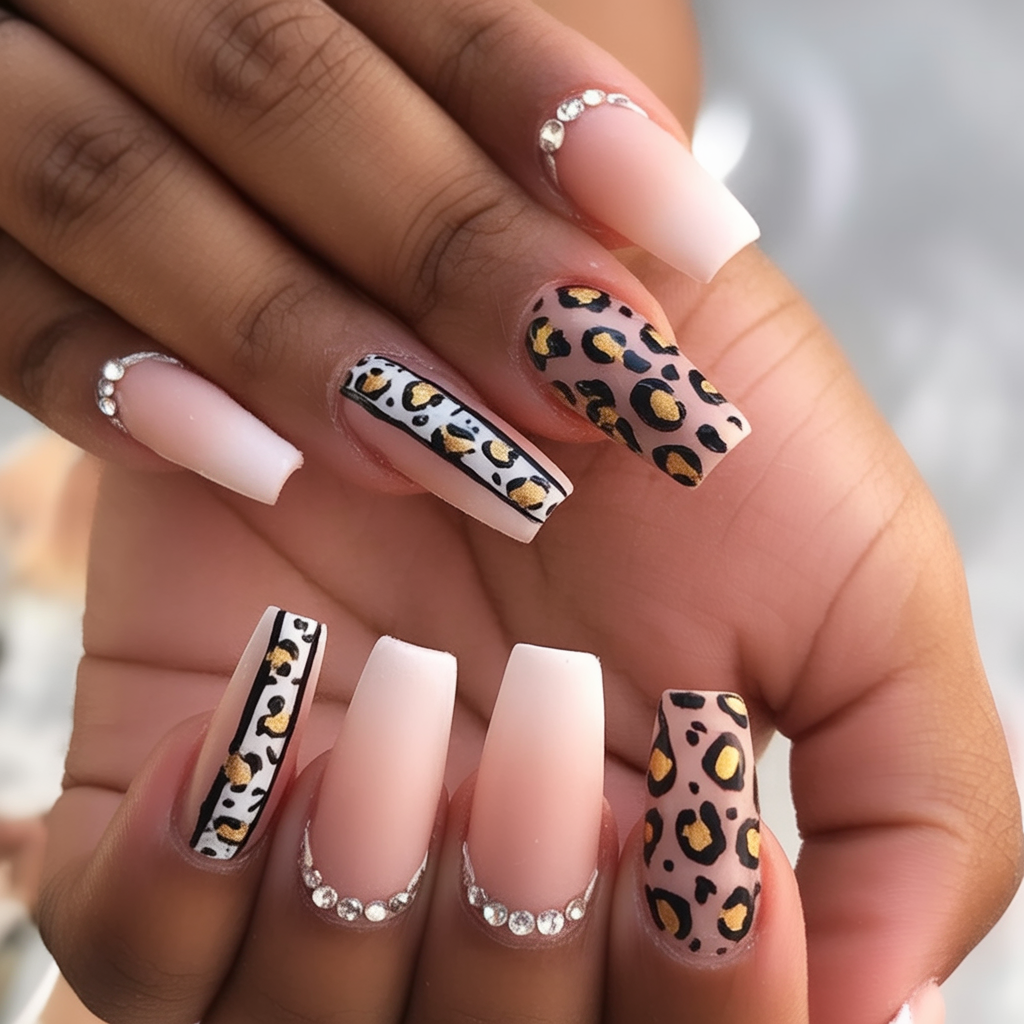 Soft nude fading into leopard-patterned bands and full-print accents, with a delicate arc of crystals at the cuticle for just-right sparkle. The coffin shape adds length and class, while the black and brown spots keep the glam grounded. It’s classy holiday glam—perfect for vacations or any day your hands need to do the talking. A design that photographs beautifully and feels luxe in real life. The current motivation is that animal prints are trending again, and this one is cute, refined, and classy. The stones are placed away from the edge, and the growth is forgiving, so snagging will be minimal. For balance and a sturdy builder base, ask for medium-long length.