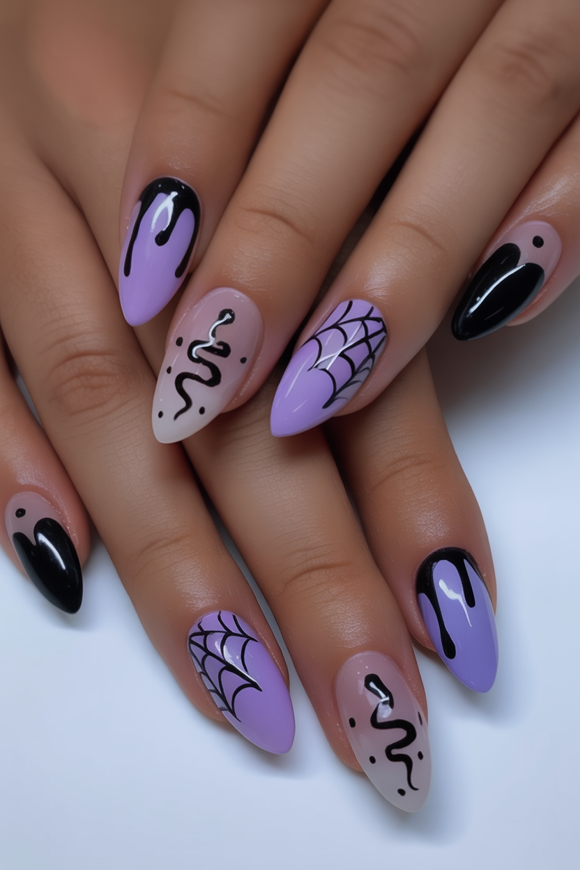 Candy-lilac meets slick Black in a playful mash-up of drips, webs, and doodled squiggles. The almond silhouette keeps the art elegant, and the alternating designs make every finger a tiny scene. It’s Halloween without the scare—more chic than spooky—and looks amazing wrapped around a latte cup or a party glass. Expect plenty of “Where did you get those?” moments. What to wear it with: lean into contrast—black knits, leather jackets, and silver hoops to echo the cool tones. A berry lip or pink blush keeps it girly. If you want longevity, place the busiest designs on the middle and ring fingers and keep others Simple, so growth is softer. This set also works in purple for October and in blue or green for late winter.