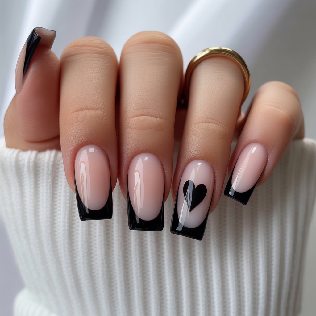 A long square silhouette telegraphs fashion-girl confidence the second your hand moves. Here, a sheer nude base meets a razor-clean A black French tip and one tiny heart soften the graphic mood. The squared corners give that tailored, editorial line you see in salon close-ups, while the single accent keeps the design Simple and grown-up. It’s the manicure equivalent of a little black dress with a wink—minimal, modern, and quietly romantic. What makes it special: square shapes offer more canvas for precision, so the contrast reads bolder than on rounded tips. Ask for a micro smile line for 2026 polish. Keep lengths even to emphasize the long square symmetry, and finish with a gel top for chip resistance. This set pairs with pearls, crisp shirts, and structured coats; it also transitions beautifully into wedding guest season or holiday dinners.