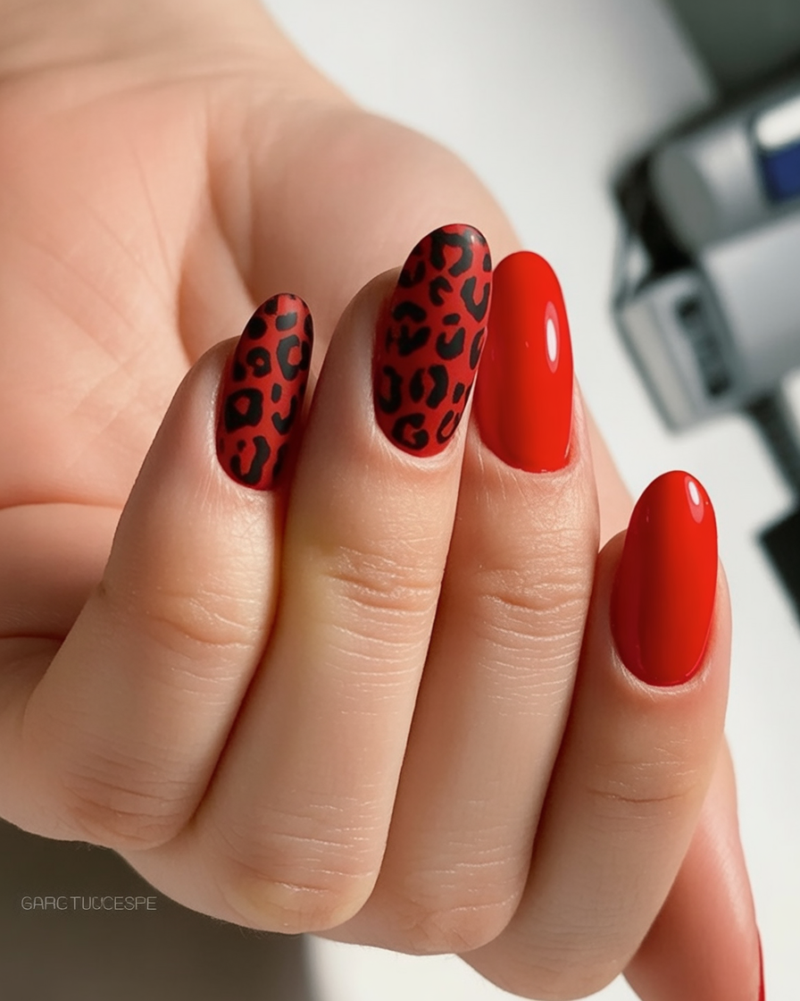 When you want power without fuss, red lacquer on a softly rounded oval delivers instant polish. Two nails step out with leopard accents so the pattern feels curated, not busy, and the high-gloss finish reads expensive. The mix of brown and black spots over a nude base keeps the print chic, while the solid red ties your whole look together—from denim to date night—no wardrobe overhaul required. Confident, a little wild, and completely wearable. Styling tips: apply thin coats for that glass-like finish and oil cuticles nightly so the shine stays crisp. Leopard looks richest over a beige or soft pink base; keep the spots irregular for a natural feel. If you live in gel, ask for a rubber base for extra strength. Pair with a red lip, small hoops, and a blazer for an easy office-to-evening transition. Durable, flattering, and full of ideas you can tweak season after season.