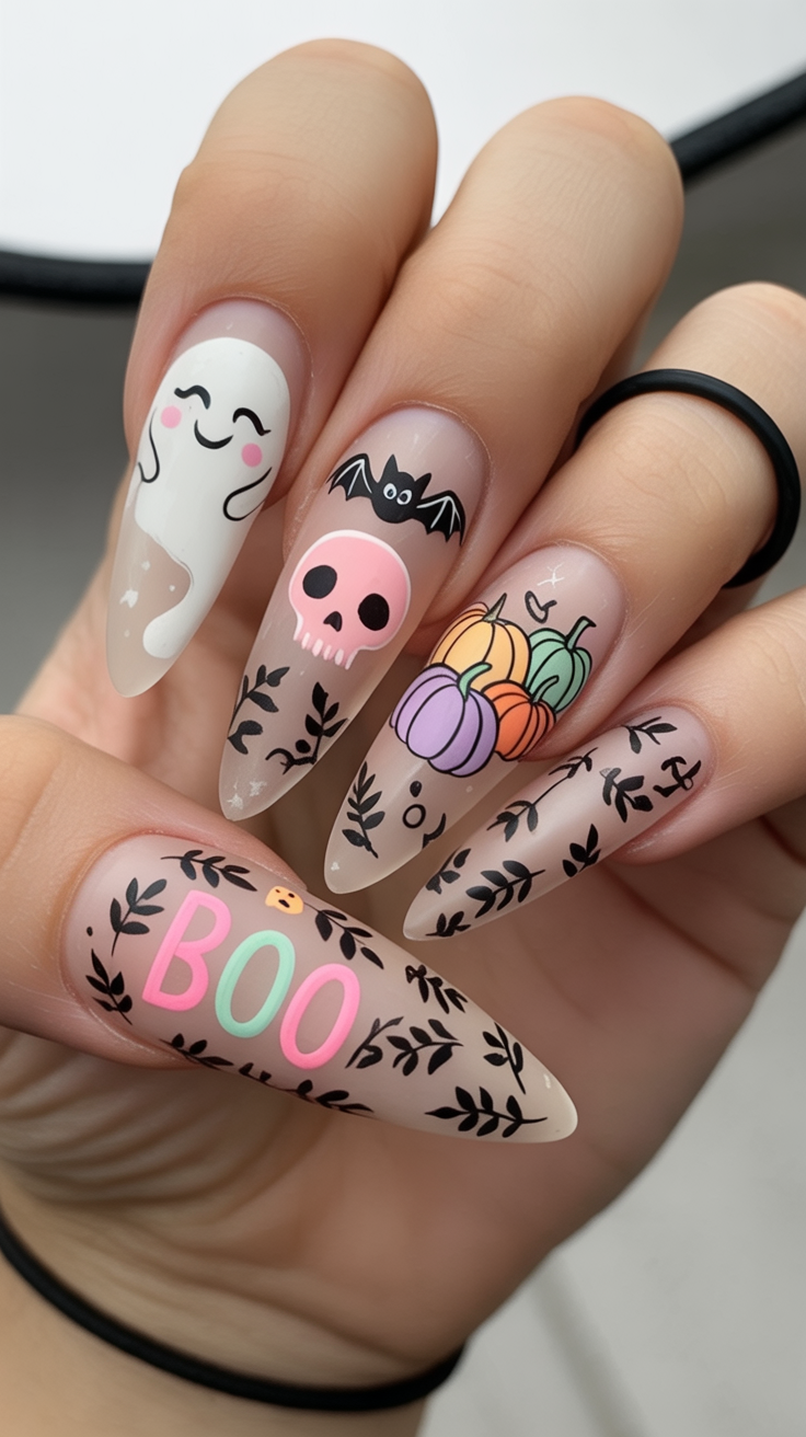 Sweet meets spooky in this playful Halloween set where a smiling ghost, tiny bat, and pastel pumpkins float over a soft sheer base. The almond silhouette keeps everything graceful, while crisp black foliage and the neon “Boo” lettering add contrast that photographs beautifully. It’s cute without being childish, a clever twist on seasonal designs that still feels chic at brunch or a school event. The mix of purple, green, and orange details keeps the palette lively, and the matte finish gives that velvety look that reads modern on Pinterest boards full of ideas for October.