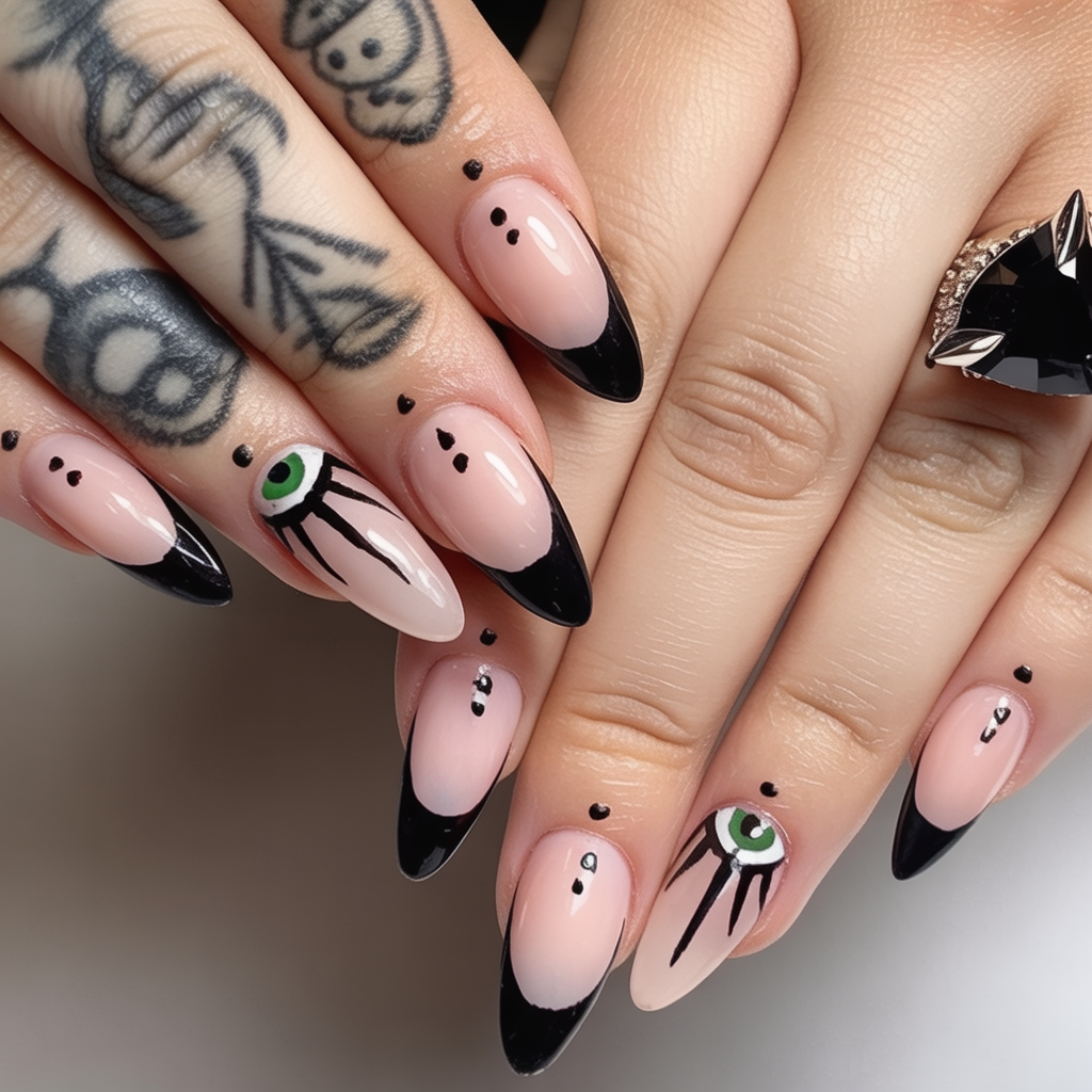 The drama of a tapered almond silhouette meets an inky French tip, and the effect is sleek, a little mysterious, and very put-together. A glossy natural nude base keeps everything elegant, while the crisp black edge frames the fingertip like eyeliner. The tiny dots and the single-eye motif add just enough attitude to feel unique without tipping into costume—think quiet Halloween energy you can wear any month. It’s the manicure that turns coffee runs into style moments and racks up saves on Pinterest for fresh designs and ideas. Who it’s for: Almond shapes elongate fingers and flatter most nail beds, so they’re perfect if you like a girly yet refined finish. Ask your tech for a thin French tip and a high-shine gel top coat for two-week gloss. Keep art on one or two nails so the look stays Simple and wearable for work. Works beautifully at short or long lengths and pairs with black knits, white shirts, and minimal gold jewelry.
