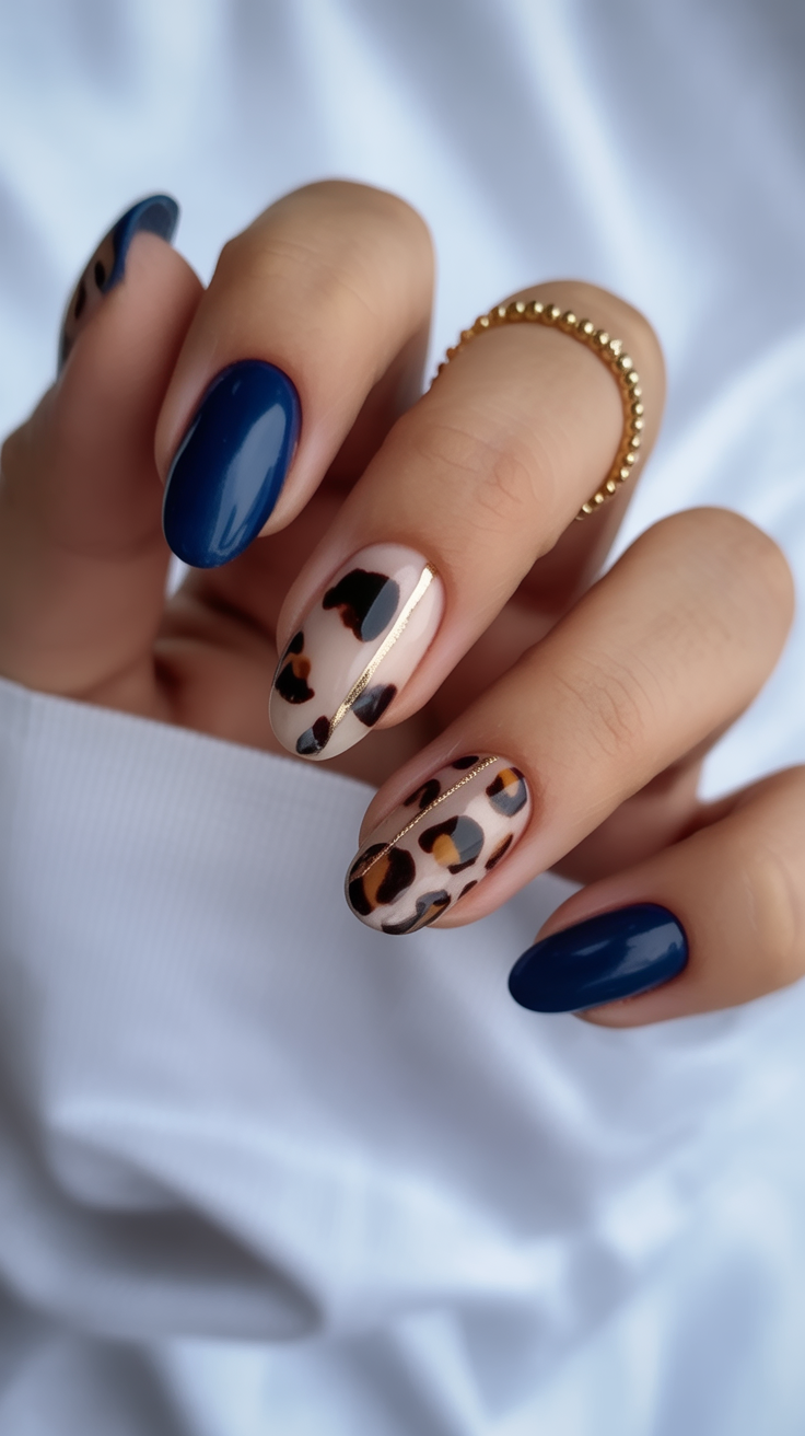 Midnight Blue cream meets warm tortoiseshell for a sophisticated high-low mix. The solid nails ground the look, while the marbled brown and black pattern brings depth, and a slim metallic stripe adds just enough shine. On almond, the combination feels like deliberate and quiet luxury—polished for the office, striking at dinner, and endlessly remixable with your wardrobe. Comparison: if leopard feels too bold, tortoiseshell is its refined cousin—still patterned, but softer and more versatile. Ask your tech to keep blue on the thumb and pinky for balance and place the marbling center stage. A glossy topcoat amplifies the depth. This set loves gold jewelry, camel coats, navy knits, and structured bags; it’s an easy way to rotate color without leaving your comfort zone.